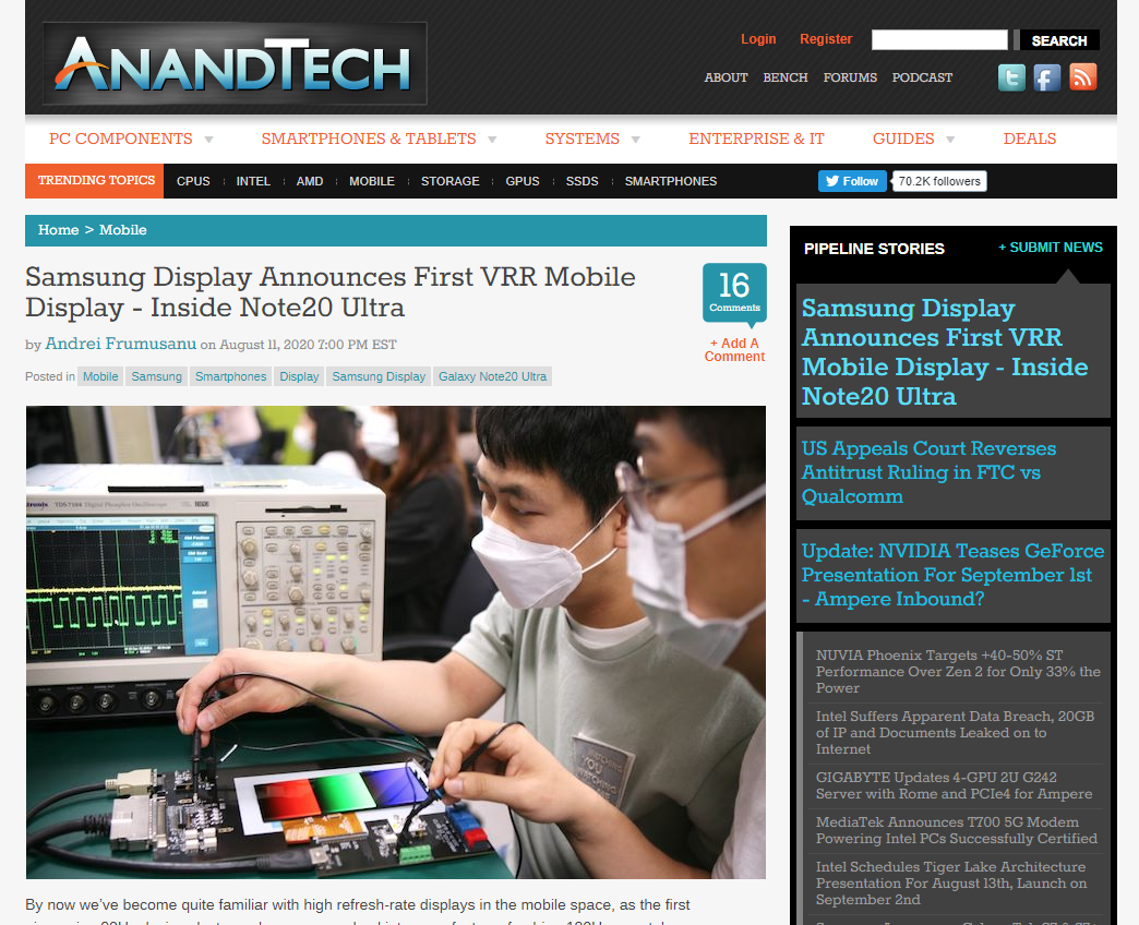 이 기술은 6.9인치 AMOLED 디스플레이를 장착한 삼성 갤럭시 노트20 울트라에 탑재될 예정입니다. 이런 걸 보면 삼성디스플레이 기술은 대단하네요.