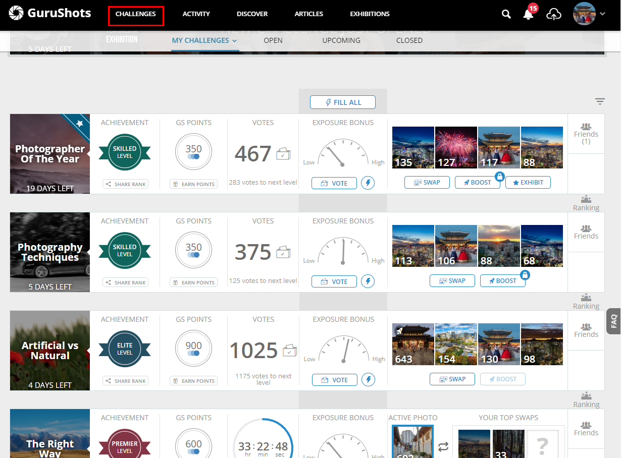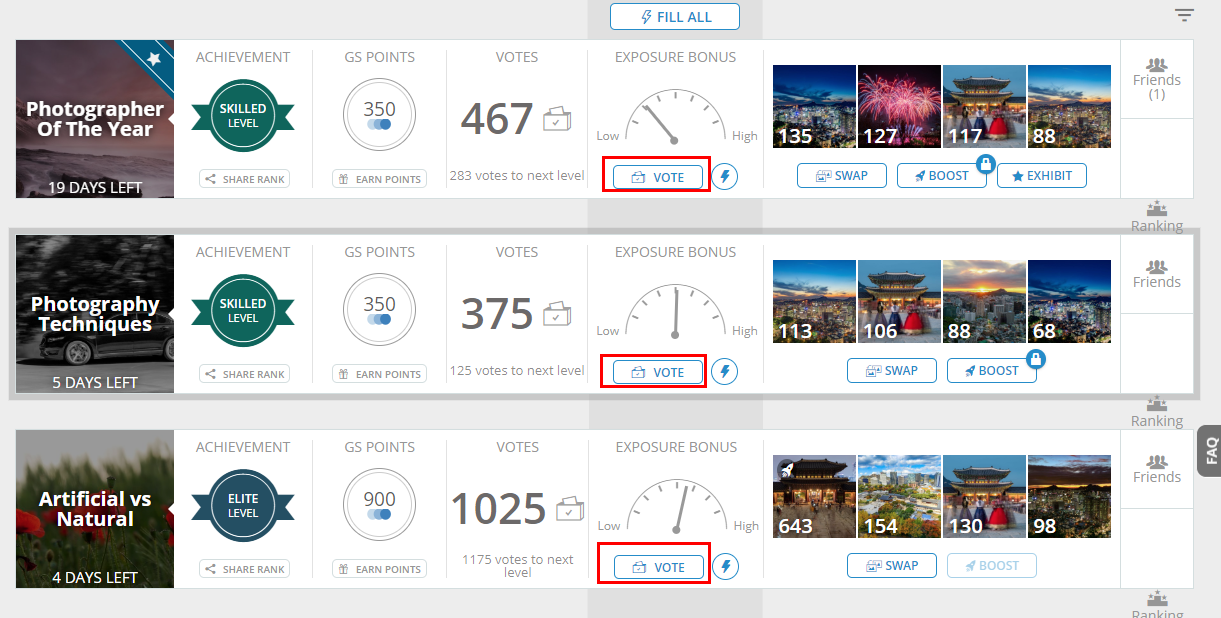 사진만 올리고 남들이 알아서 투표 해 주겠지라고 생각하면 안 됩니다. 구루샷은 사진을 올린 사람이 다른 사람의 사진을 투표를 꾸준히 해야 합니다. 위 5개의 사진 챌린지 중간에 보면 계기판 게이지가 있습니다. 여기서 게이지가 LOW로 가 있으면 내 사진이 사진 챌린지에서 노출이 안 됩니다. 노출이 안 된다는 건 사진이 안 보인다는 것이고 안 보이면 투표를 받을 수 없습니다. 내 사진을 많이 노출시키려면 VOTE를 눌러서 다른 사람의 사진을 보고 좋은 사진에 투표(보트)를 해야 합니다. 아주 영리한 방법입니다. 이렇게 투표를 독려하는 제도를 만들어야 투표가 활발하게 이루어집니다.