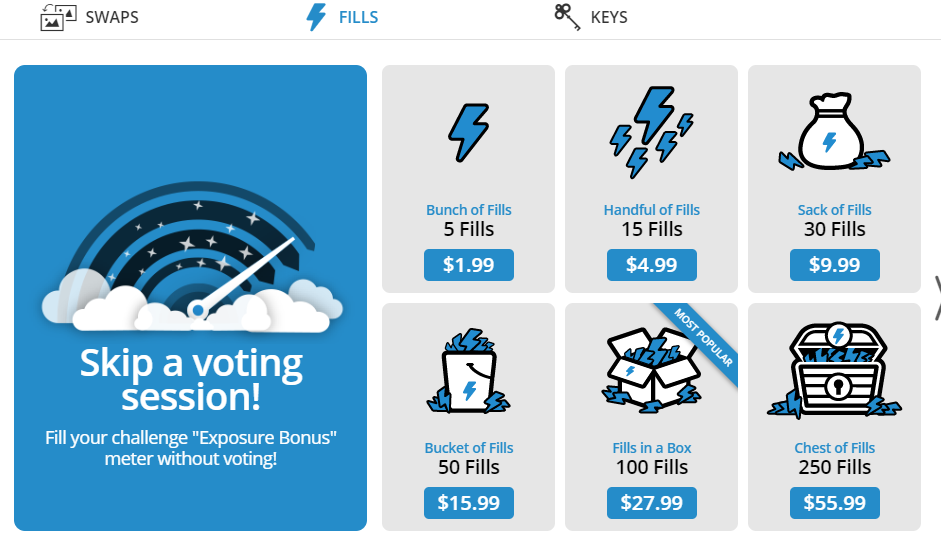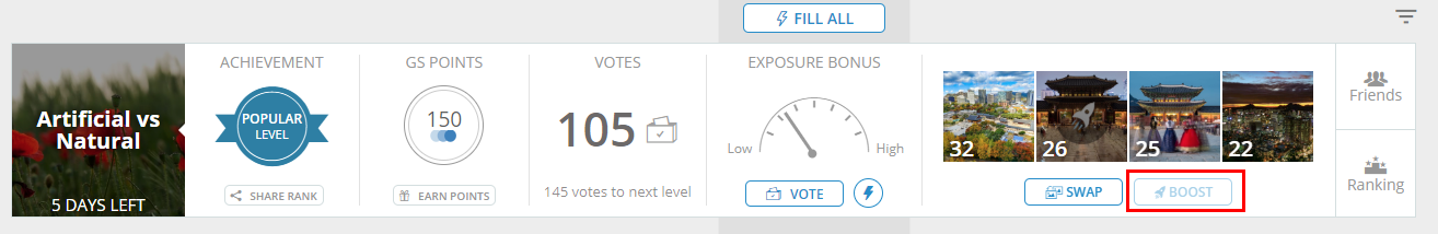 VOTE를 눌러서 노출 게이지를 올리면 사람들이 내 사진을 보고 투표를 합니다. 4장의 사진을 올렸는데 32, 26, 25, 22 추천을 받았네요. 인기가 떨어지는 사진은 SWAP을 눌러서 다른 사진으로 교체가 가능합니다. 단 무한정 할 수 없습니다. 따라서 업로드할 때 신중하게 올려야 합니다. BOOST는 투표를 해서 노출 게이지를 올릴 수 없는 분들을 위해서 만들어졌습니다. 수시로 접속해서 노출 게이지를 올려야 하는데 시간이 없으면 BOOST를 눌러서 남들보다 노출을 더 많이 할 수 있습니다. 노출 게이지 VOTE 옆에 번개 모양의 Fill은 노출 게이지를 단박에 풀로 충전해 줍니다.