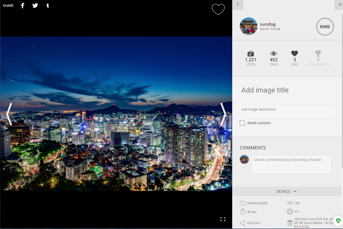 사진은 미리 올려놓을 수 있습니다. 어차피 사진 챌린지에 올릴 수 있는 사진은 최대 4장 정도입니다. 따라서 미리 업로드 해 놓았다가 챌린지가 끝나고 새로운 챌린지가 시작되면 다른 사진을 업로드해서 평가받으면 됩니다. 사진마다 투표 숫자와 VIEWS와 좋아요가 있습니다. VIEWS는 정확하게 모르겠지만 사진을 크게 확대해서 본 사람들의 숫자 같기도 합니다. 사진마다 제목을 달 수 있고 코멘트도 달 수 있습니다. 영어권자가 많으니 영어로 소개하면 더 추천을 많이 받을 수 있겠죠.