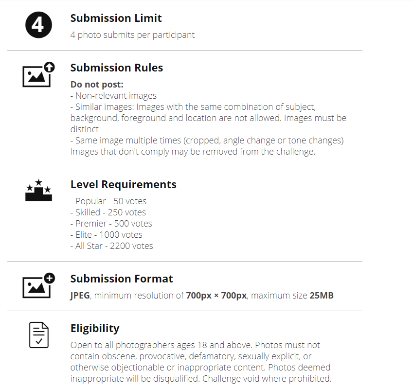 룰을 보면 700px x 700px 이상 해상도의 사진을 올리라고 하네요. 전 이것도 모르고 이보다 작은 사진 올렸다가 왜 안 올라가나 했는데 최소 해상도가 있습니다. 이는 사진 챌린지마다 다릅니다. 최대 용량은 25MB입니다.