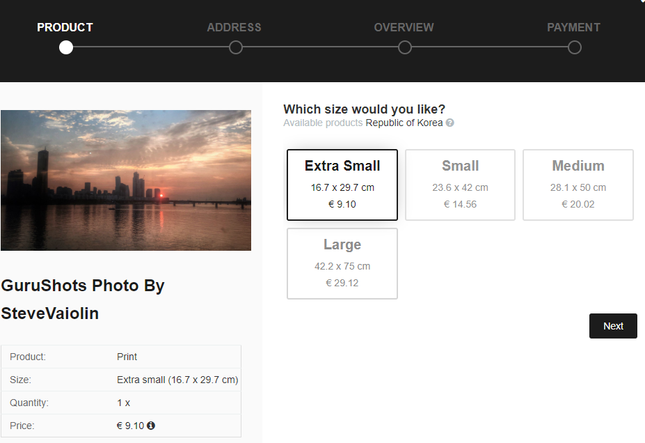 제 예상이 맞았네요. 해상도 크기별로 가격이 나와 있네요. 유럽 서비스라서 유로화가 쓰여 있네요. 장수를 선택하고 출력 결제를 하면 출력물이 유럽에서 날아오나 봅니다. 그럼 이 수익의 일부는 저작권자에게 돌아갈 듯하네요.