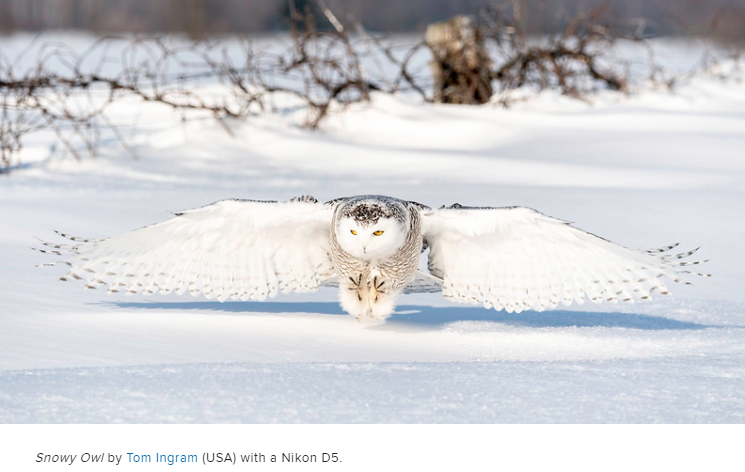 하얀 올빼미가 지는 태양 앞에 서 있습니다. 사진가는 태양인 줄 알고 촬영한 사진을 집에서 확인해 보니 슈퍼문이었습니다. 달이 너무 밝아서 태양으로 착각하고 촬영한 사진이네요.