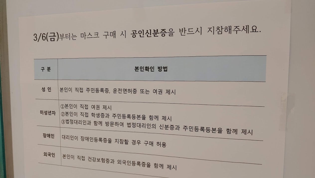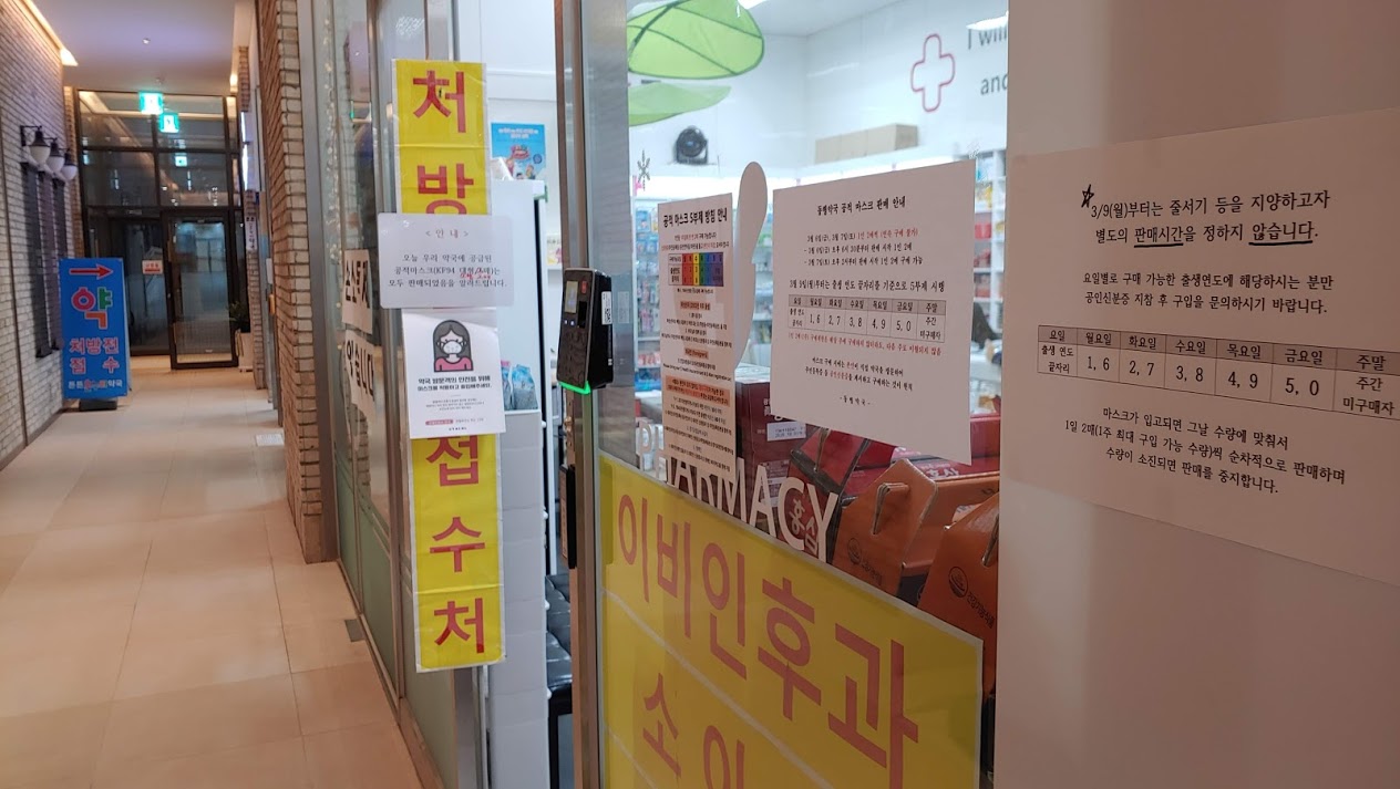 마스크가 다 떨어졌습니다. 1개 가지고 1주일 이상 사용하시는 부모님 마스크를 구매하기 위해서 약국을 찾았습니다. 3월 9일부터 정부는 공적 마스크를 배포하고 있습니다. 한 사람이 1주일에 2개를 살 수 있습니다. 1주일에 2개로 어떻게 버티냐고 하지만 지금 수요를 공급이 따라가지 못해서 어쩔 수 없습니다.