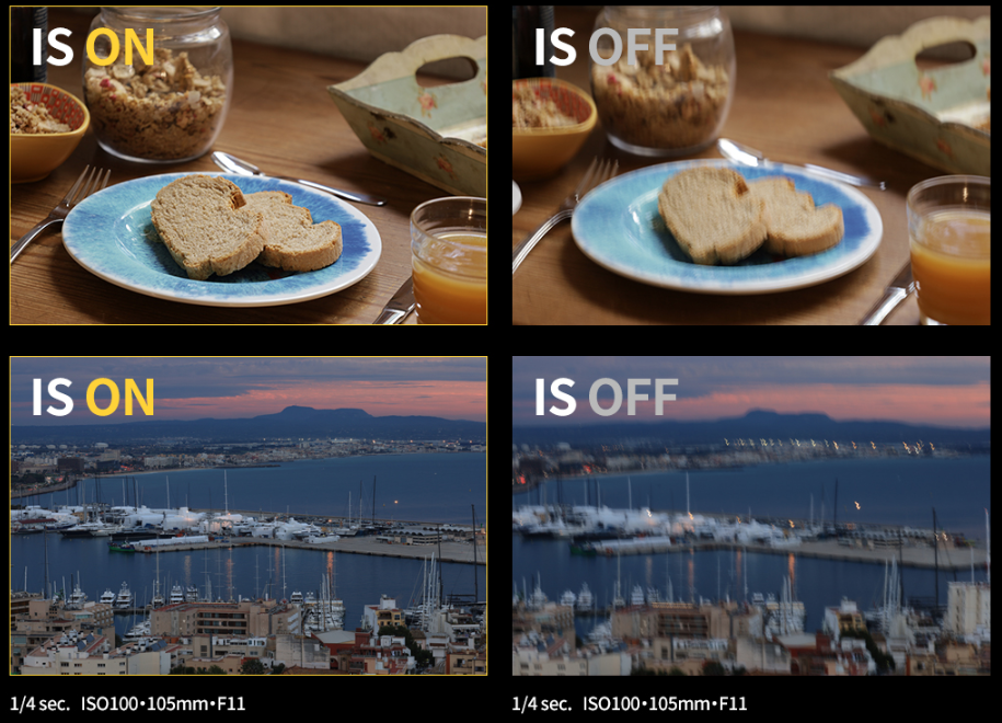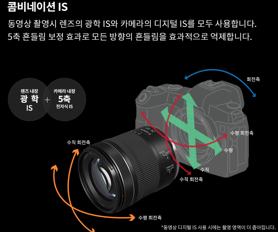 EOS R, EOS RP의 전자식 IS와 광학 IS를 이용하면 5축 손떨림 보정을 사용할 수 있습니다. 앞으로 나올 캐논 카메라들은 바디에 전자식이 아닌 광학 손떨방이 들어간다고 하는데 바디와 렌즈 손떨방을 합쳐서 좀 더 뛰어난 손떨방을 제공하겠네요.