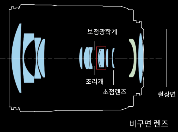 렌즈는 11군 13매 비구면 렌즈 1매가 들어가 있습니다. 위 이미지에서 녹색이 비구면 렌즈입니다. 조리개 날개는 7개 원형 조리개가 들어가 있고 최대 조리개 수치는 F22입니다.