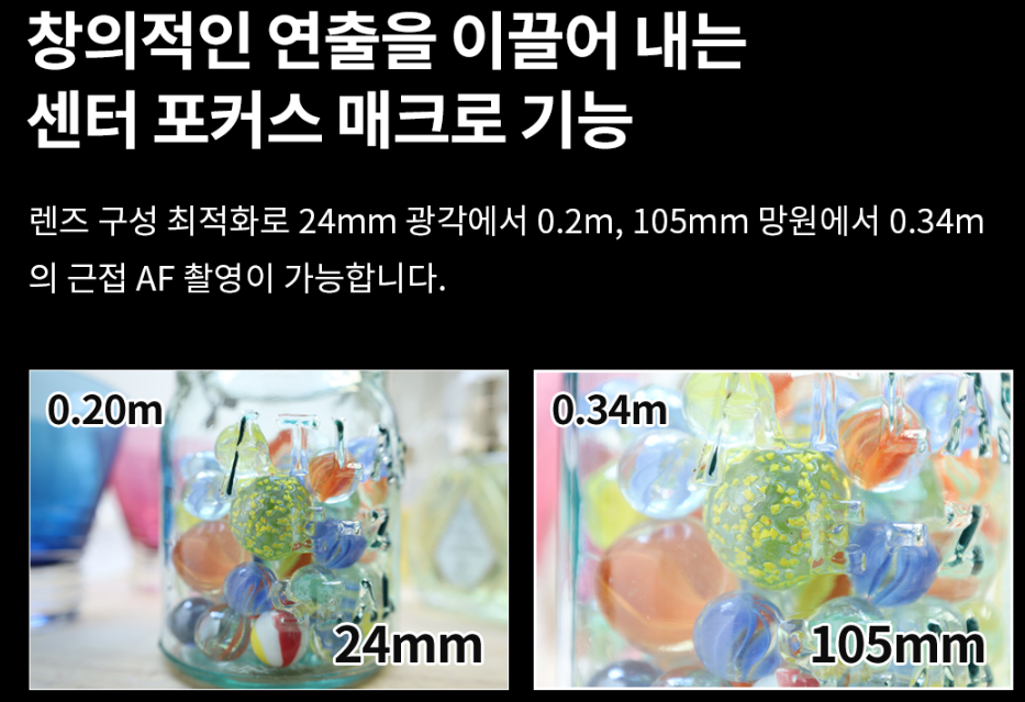캐논 RF 24-105mm F4-7.1 IS STM는 최단 촬영 거리는 20~34cm이며 MF시에는 13~34cm로 줄일 수 있습니다. 최대 광각 시에는 13cm 거리에서 초점을 맞출 수 있습니다. 이 기능이 센터 포커스 매크로 기능으로 이 렌즈의 독특한 장점입니다.