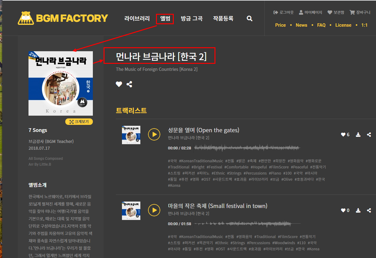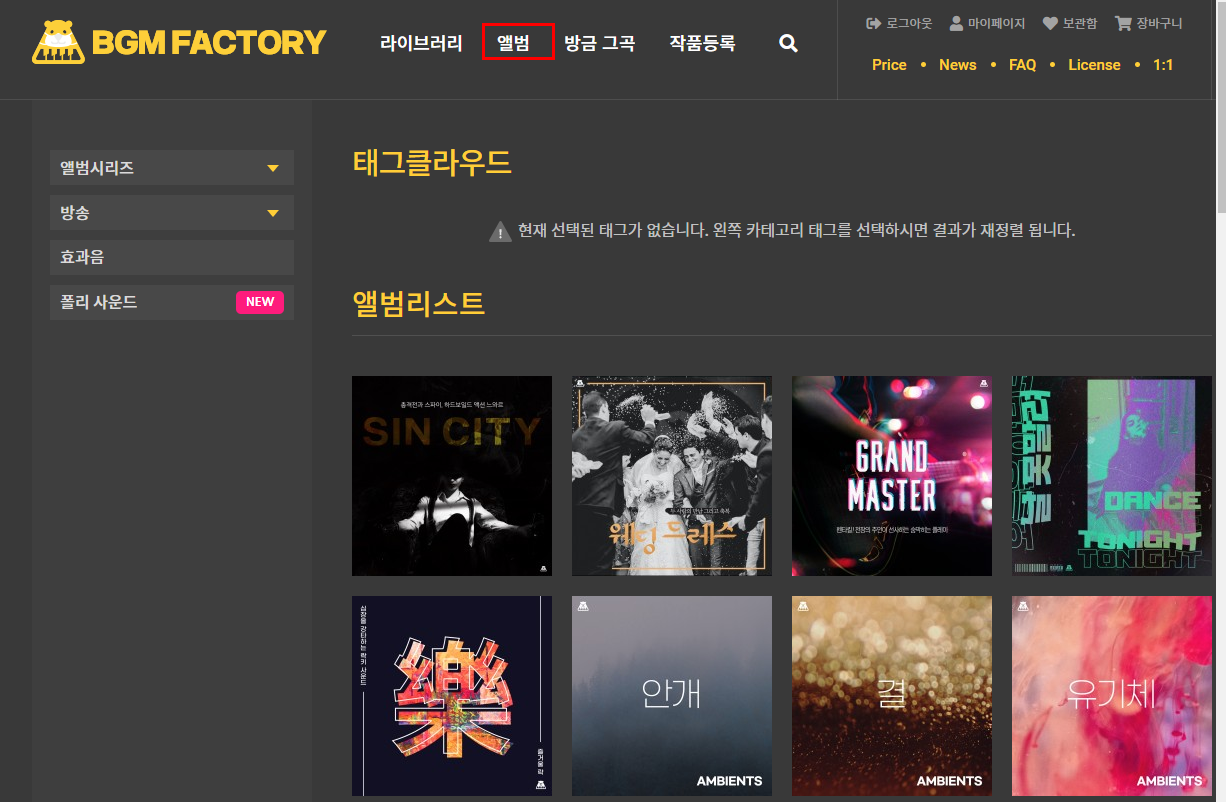 앨범을 선택하면 음반 앨범처럼 비슷한 주제의 브금을 모아 놓았습니다. 앨범을 선택하면 비슷한 분위기의 노래들을 들을 수 있습니다.