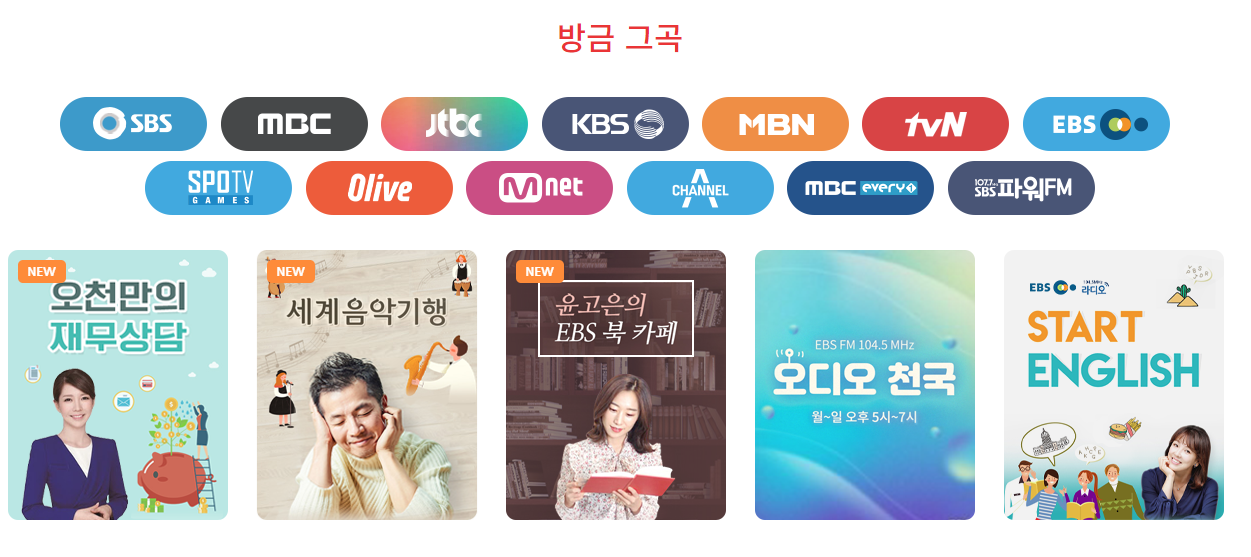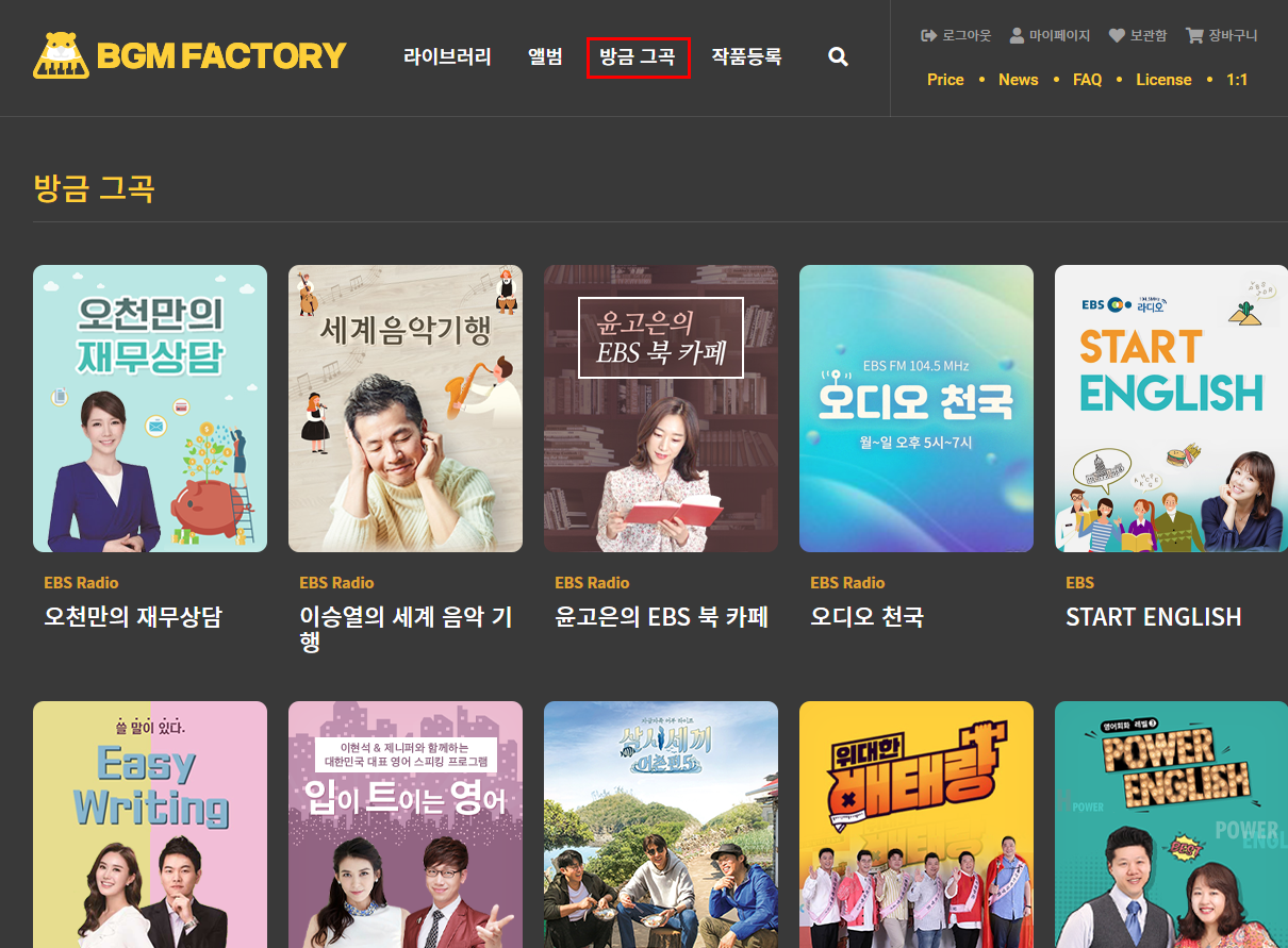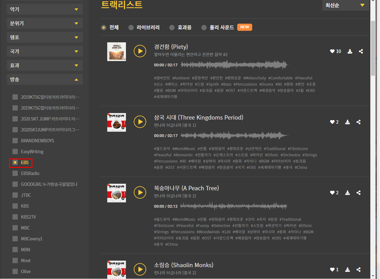 이 카테고리에서 가장 먼저 눈길이 가는 곳은 방송입니다. 수많은 배경음악이 있어도 어떤 배경음악이 좋은지 고르기가 쉽지 않습니다. 이런 갈등에서 가장 큰 영향을 주는 것은 프로들의 선택입니다. 영상 제작 프로들이 선택했다는 건 기본 퀄은 제공한다는 것이죠. 방송을 누르면 방송사에서 사용한 브금(배경음악)들이 소개됩니다.