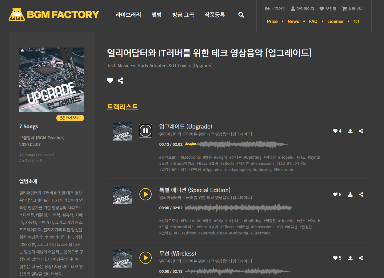 수많은 브금 앨범이 있는데 신기하게도 음원 저작권자가 브금 강사분이 많이 보입니다. 참고로 이 BGM팩토리는 내가 작곡한 브금을 등록하는 시스템은 없고 검증받은 브금 전문 작곡가 분이 많은 곡을 제작합니다. 이 중에서 브금 강사님이 가장 많더라고요. 한 사람인지 작곡가 그룹인지 모르겠지만 너무 한 사람이 다 제작하면 다양성이 떨어질 수 있는데 신기하게도 장르, 분위기가 다 다름에도 퀄리티가 아주 좋습니다.