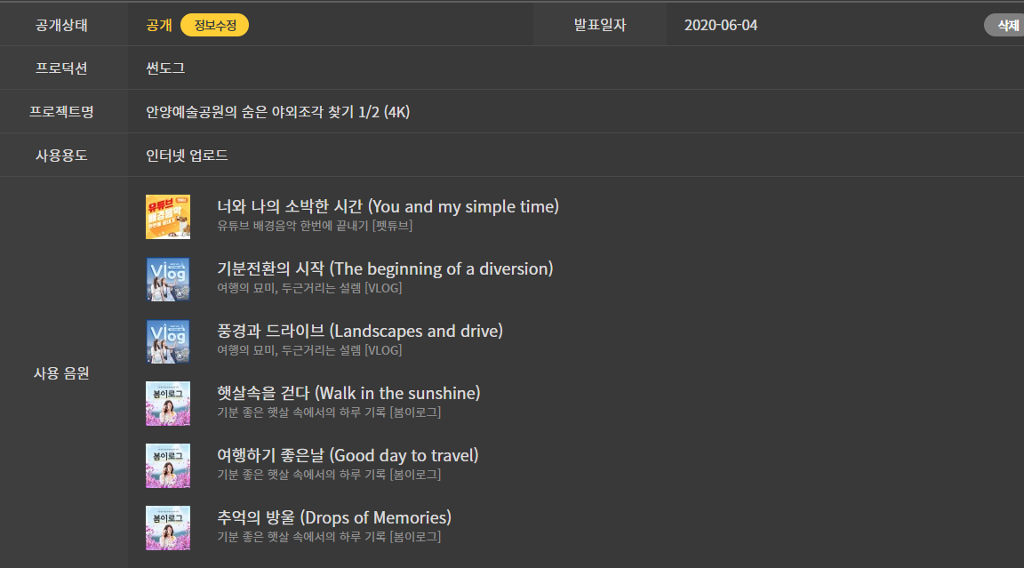 별거 아니지만 영상 업로드한 후 매번 일일이 등록하는 것이 참 귀찮을 수 있습니다. 그러나 등록을 해보면 생각보다 간편합니다. 먼저 유튜브 동영상 URL과 영상 제목을 올린 후에 사용한 배경음악을 클릭으로 쉽게 첨부할 수 있습니다.