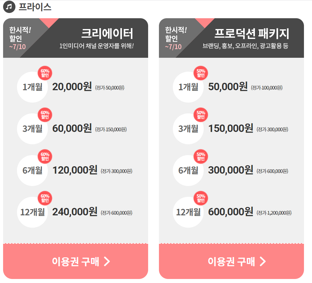 유튜버 같은 크리에이터는 1개월에 5만 원, 3개월에 15만 원 6개월에 30만 원 1년에 60만 원입니다. 방송사나 영상 제작사는 좀 더 높은 1개월 10만 원, 12개월에 120만 원입니다. 싸다면 싸고 저렴하다면 저렴할 수 있습니다.