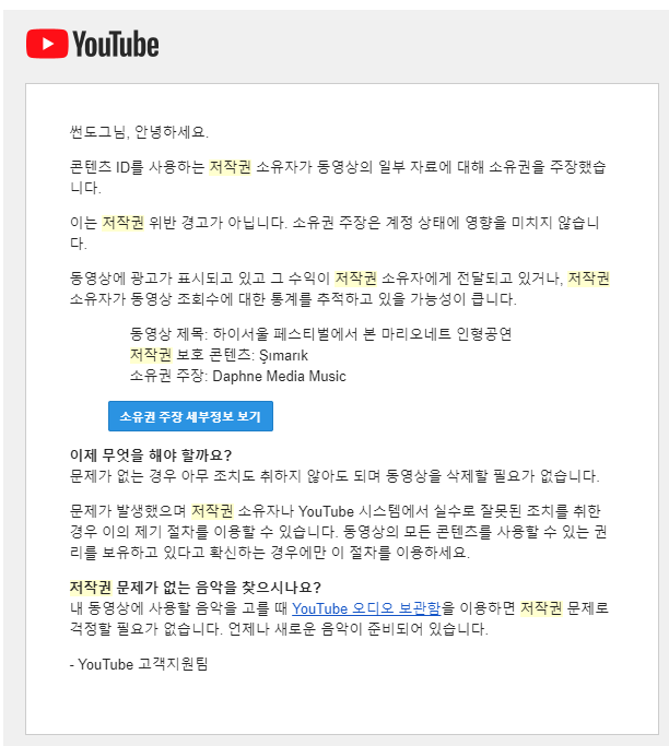 이런 경우도 있습니다. 위 메일 내용은 거리 공연을 촬영한 영상을 유튜브에 업로드했는데 그 거리 공연에서 사용한 노래가 저작권자가 있다는 메일입니다. 저작권 경고 메일은 아니지만 이런 메일 받을 때마다 짜증이 납니다. 아니 내가 넣고 싶어서 넣은 거도 아니고 길거리에 흘러나오는 음악으로도 저작권 침해라면 어쩌라는 건지. 더 짜증 나는 건 동영상을 비공개로 돌려도 저 메일이 또 날아옵니다. 그것도 같은 이유로 계속 날아옵니다. 너무 화가 나서 유튜브에 항의성 메일을 보냈더니 원래 그렇다고 하네요. 삭제하지 않는 한 비공개로 돌려도 저 저작권 메일이 계속 날아갈 수 있다고 합니다. 이에 유튜브는 길거리 음악 소리만 지우거나 다른 음악으로 대체하는 기능을 유튜브 스튜디오에 넣고 있습니다.