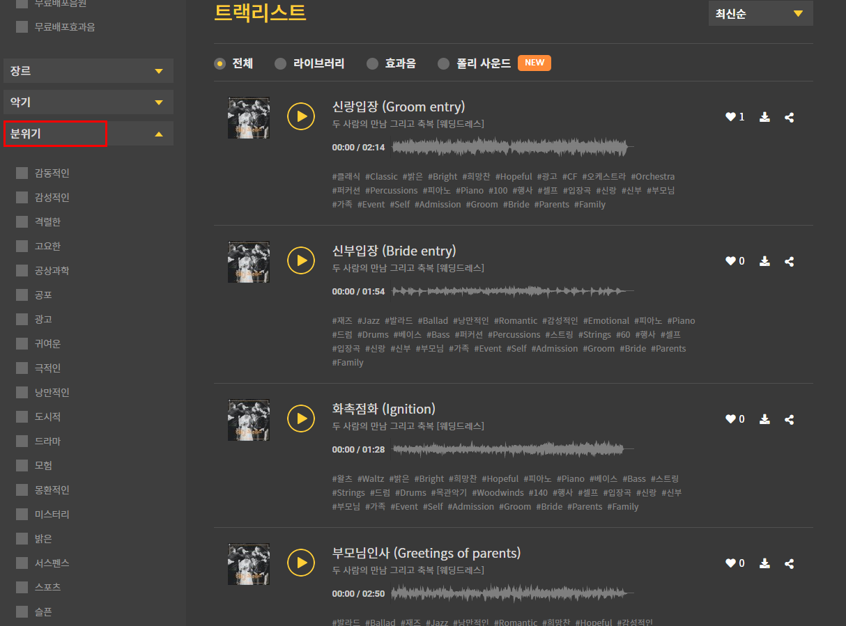 저 같은 경우는 분위기가 가장 좋네요. 아무래도 유튜브 영상은 밝고 맑고 경쾌한 브금을 선호하는데 보시면 고요하고 결렬하고 감성적이고 밝은 분위기를 선택하면 관련 브금이 도열되어서 나옵니다. 브금을 들어보고 좋은 음악들은 하트를 누르면 WISHLIST에서 볼 수 있고 다음 영상 제작할 때 선택하기 편리합니다.