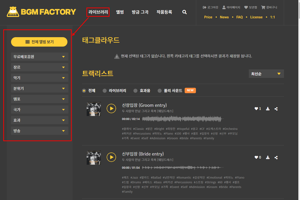 BGM 팩토리에 들어가면 상단에 라이브러리, 앨범, 방금 그 곡, 작품 등록 4개의 메뉴가 있습니다. 이 중에서 라이브러리는 내가 원하는 배경음악을 가장 쉽게 고를 수 있는 메뉴입니다.