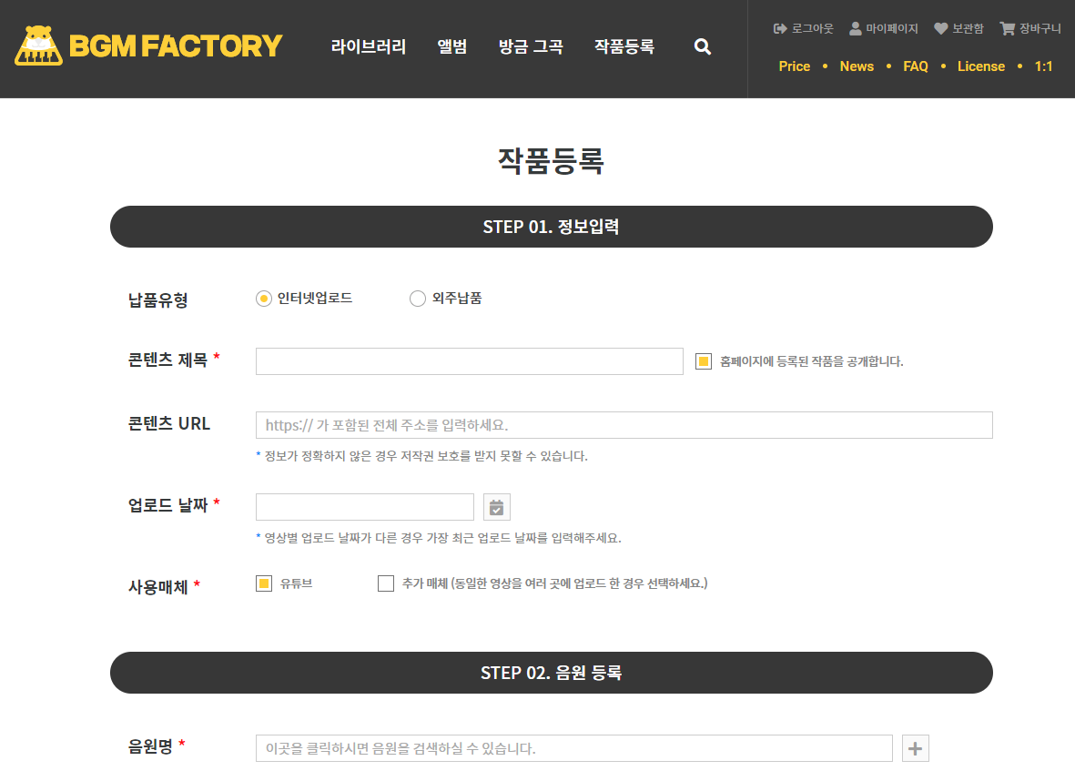 비지엠 펙토리에서 다운로드해서 사용한 BGM을 이용해서 영상 제작을 한 후에 유튜브를 포함 다양한 동영상 플랫폼에 업로드한 후에 작품을 등록해야 합니다. 작품 등록을 왜 하냐 하면 월정액으로 결제한 후에 BGM팩토리에서 내려받은 배경음악을 사용한 영상을 유튜브에 올리면 간혹 유튜브 콘텐츠 ID AI가 저작권 침해했다는 메일을 보내기도 합니다.