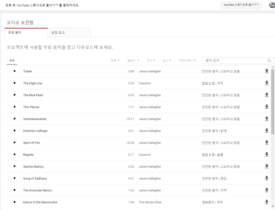 이러니 좋은 배경 음악을 찾아서 이리저리 돌아다니지만 저작권자가 있어서 함부로 사용할 수 없습니다. 그렇다고 유튜브에서 제공하는 무료 음원은 너무 한국 취향이 아닙니다. 게다가 종류도 많지 않고 인기 있는 곡들만 인기 있어서 유튜브 영상을 보다 보면 유튜브 무료 음원임을 바로 알 수 있을 정도입니다.