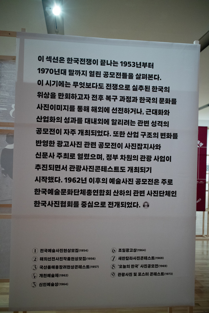 한국전쟁이 끝난 후 한국 정부는 전쟁 이미지와 낙후된 이미지의 한국의 이미지를 지우기 위해서 근대화, 산업화의 성과나 한국의 아름다움을 담은 사진공모전을 개최합니다. 이는 지금까지도 이어지고 있습니다. 관변 단체인 한국사진협회 중심으로 관광사진과 같은 홍보를 목적으로 한 사진들을 공모합니다.