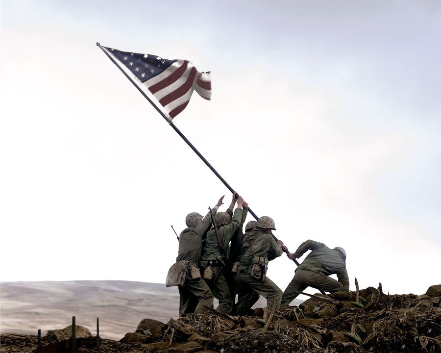 1945년 2월 AP 통신 사진기자인 '조 로젠탈'이 촬영한 이 사진은 2차 세계대전에서 미군의 승리를 상징하는 아주 유명한 사진입니다. 이 사진은 일본으로 향하던 미군이 이오지마섬에 상륙한 후 5일간의 전투 끝에 수리바치 산 꼭대기에 거대한 성조기를 6명의 미 해병대원이 꽂는 역사적인 순간을 촬영한 사진입니다.