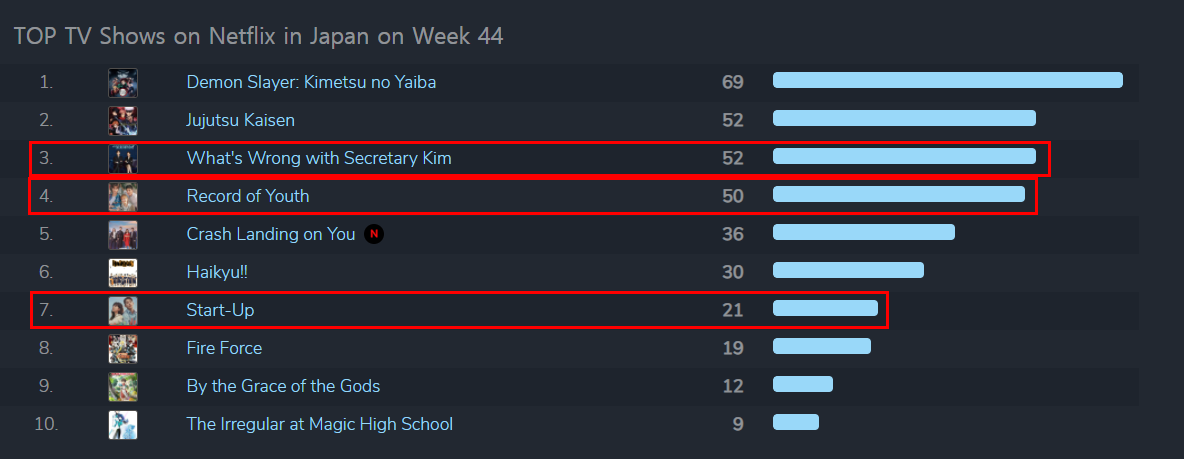 4위는 박보겸, 박소담 주연의 '청춘기록'이고 7위가 '스타트업'입니다. 이렇게 10위 안에 3편이 한국 드라마입니다. 일본은 콘텐츠 강국 특히 애니 강국입니다. 그래서 그런지 다른 나라와 인기 순위에 자국의 애니가 많이 올라와 있네요. 이런 한국 드라마의 일본 열풍으로 일본인들이 다시 한국 드라마를 많이 보고 있습니다.