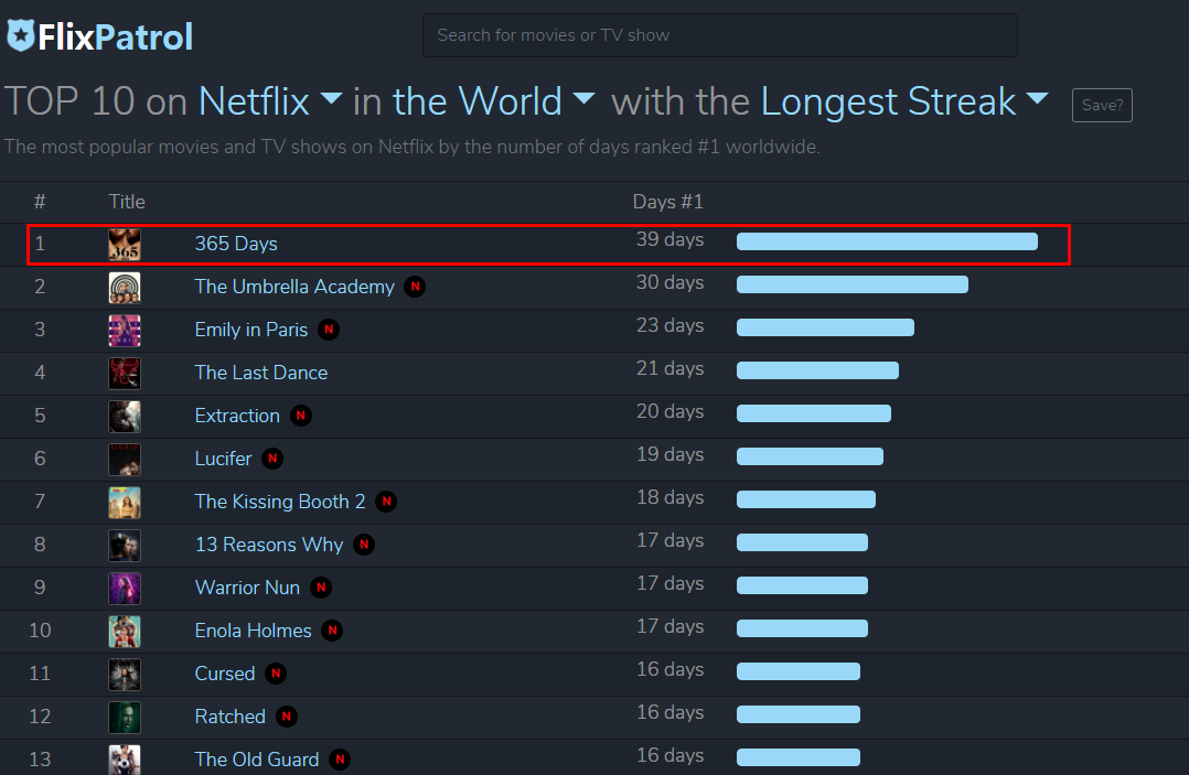 Longest Streak (최장 연승) 정렬도 있는데 이는 TOP10 안에 오래 머무른 넷플릭스 콘텐츠 순위입니다. 1위는 365 Days입니다. 이 영화 압니다. 너무 오래 TOP10 안에 들어와 있어서 뭔가 봤더니 B급 에로 영화더라고요. 영화를 스킵하면서 봐서 뭔 내용인지 모르겠지만 평은 좋지 못합니다. 그러나 확실히 말초신경은 자극하네요.