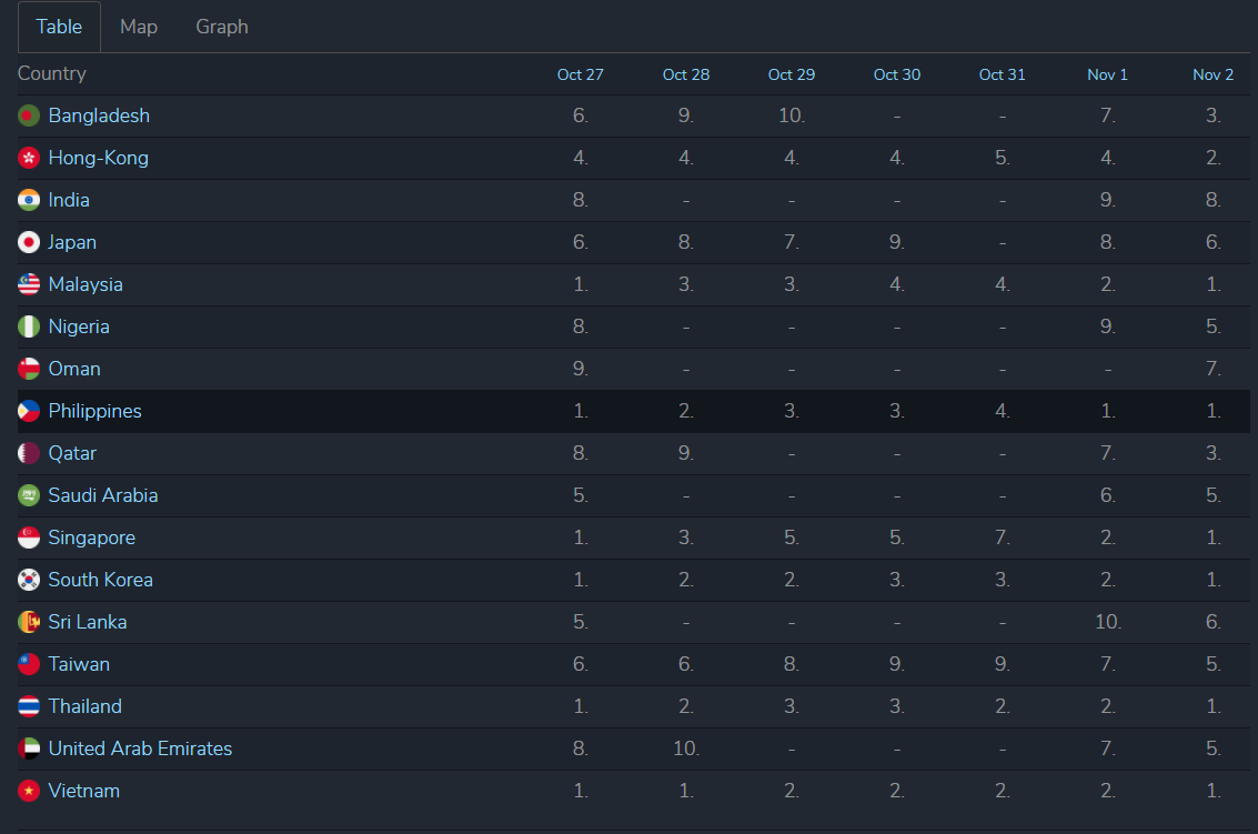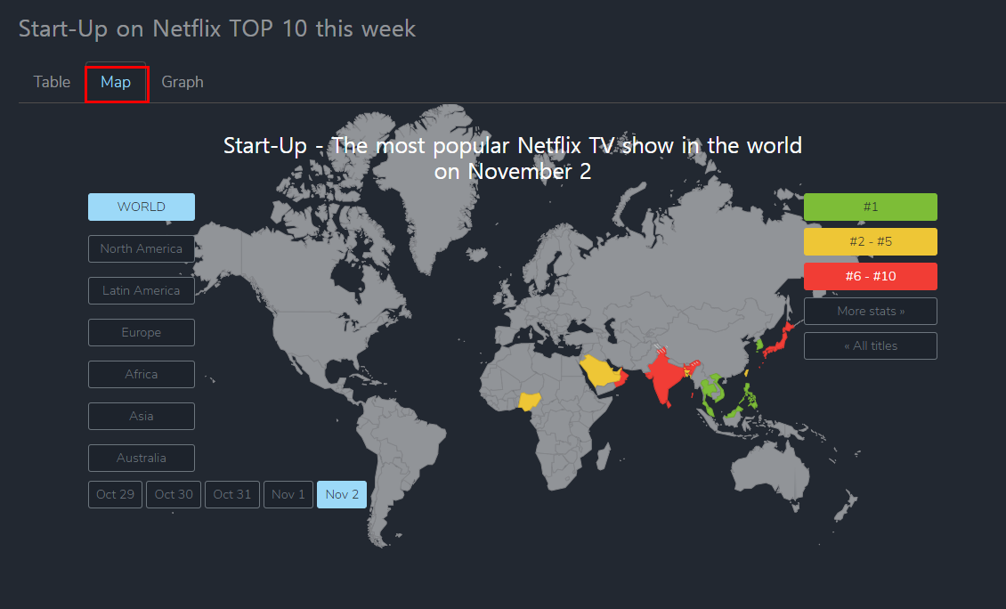 스타트업을 눌러보니 10월 말부터 11월 초까지의 각 국가별 인기 순위가 나옵니다. 예상대로 아시아에서 인기가 높네요. 방글라데시에서는 3위까지 올랐고 홍콩은 2위까지 올랐습니다. 인도에서는 10위 안에 들락거리네요. 일본에서는 6위입니다. 요즘 한국 드라마가 넷플릭스를 통해서 큰 인기를 얻고 있습니다.