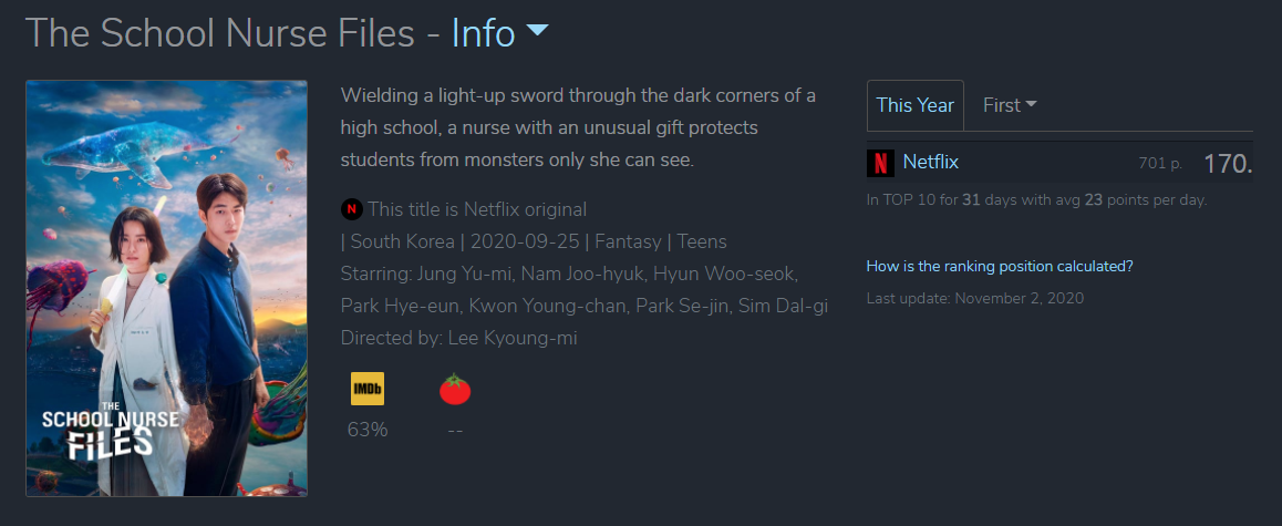 내가 궁금해 하는 콘텐츠도 검색할 수 있습니다. TV 광고, 라디오 광고, 길거리 광고 등등 광고비 엄청나게 사용한 '보건교사 안은영'은 꽤 재미있는 드라마지만 호불호가 갈리는 드라마였습니다. 돈 많이 들인 '보건교사 안은영'은 한국에서 1위를 차지하긴 했지만 빠르게 10위 권 밖으로 사라졌습니다. 전 세계에서의 인기도 높아 보이지는 않네요.