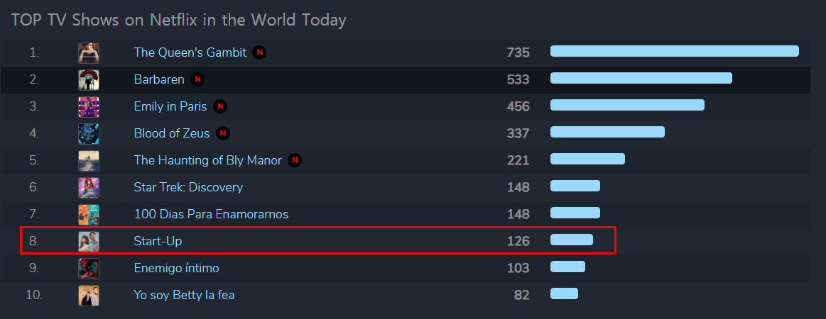 그런데 8위에 한국 드라마 '스타트업'이올랐네요. 요즘 한국 드라마의 인기가 아주 높습니다. '사이코지만 괜찮아'도 전 세계에서 큰 인기를 끌었습니다. 정말 명작 드라마입니다. 다만 동남아시아나 중동 같은 국가에서 인기가 높고 미국, 유럽 같은 곳에서는 인기가 높지는 않습니다. '스타트업'은 1,2화 보다가 좀 유치해서 보다 말았어요. 자동차 사고 장면을 보고 아직도 갑자기 자동차 사고사?라는 생각에 올드해서 보다 말았네요. 그런데 8위를 하고 있네요.