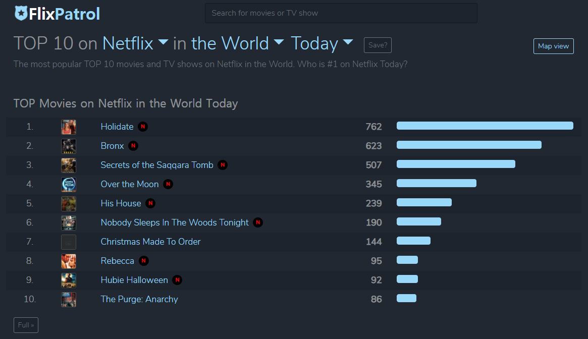 넷플릭스, 디즈티+, HBO GO의 콘텐츠의 전 세계 인기 순위를 알려주는 FlixPatrol