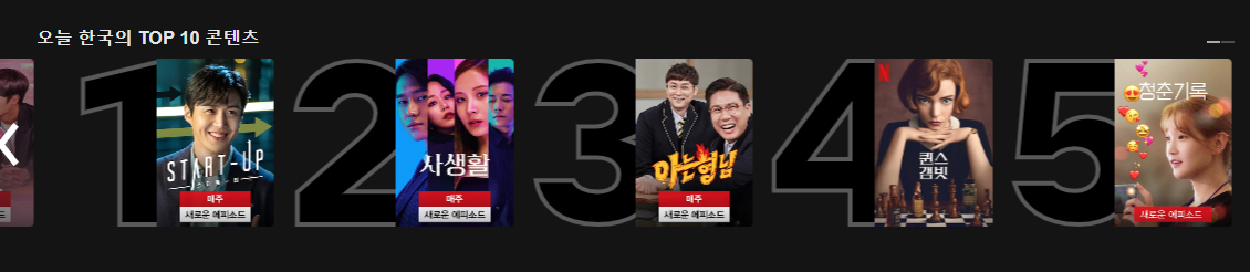 그러나 최근까지 넷플릭스는 인기 콘텐츠 순위를 소개하지 않았다가 몇달 전부터 오늘 한국에서 인기 있었던 콘텐츠 TOP 10 리스트를 소개하고 있습니다. 이번 주 한국에서 인기 있는 넷플릭스 콘텐츠는 1위가 스타트업이고 2위가 사생활, 3위가 아는 형님, 4위가 퀸스갬빛, 5위가 청춘기록으로 대부분은 한국 드라마입니다. 이걸 보면 넷플릭스는 케이블이나 공중파 2차 시장 서비스 같다는 생각마저 듭니다.