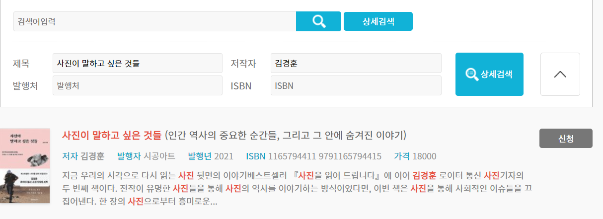 최신 도서들 중에 제가 좋아하는 사진 관련 서적은 거의 신청이 없기에 희망도서 목록 체크하고 신청했습니다. 책 정보는 알라딘이나 예스24에서 둘러보고 읽고 싶은 책을 제목, 저작자만 넣고 검색하면 하단에 검색되어서 나옵니다.