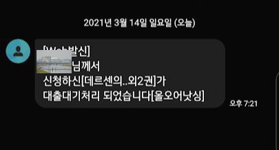 1인 3권으로 지역 도서관에 회원 가입 후에 신청을 하면 1달 후에 문자로 희망도서가 도착했다고 문자가 옵니다. 그럼 책을 찾으로 가서 새책을 읽고 3주 후에 반납을 합니다. 그런데 이 1달이 너무 길고 실제로는 2달 정도 걸립니다. 이렇게 느리게 도착하니 신청한 후에 까먹고 있으면 그때 문자가 옵니다.