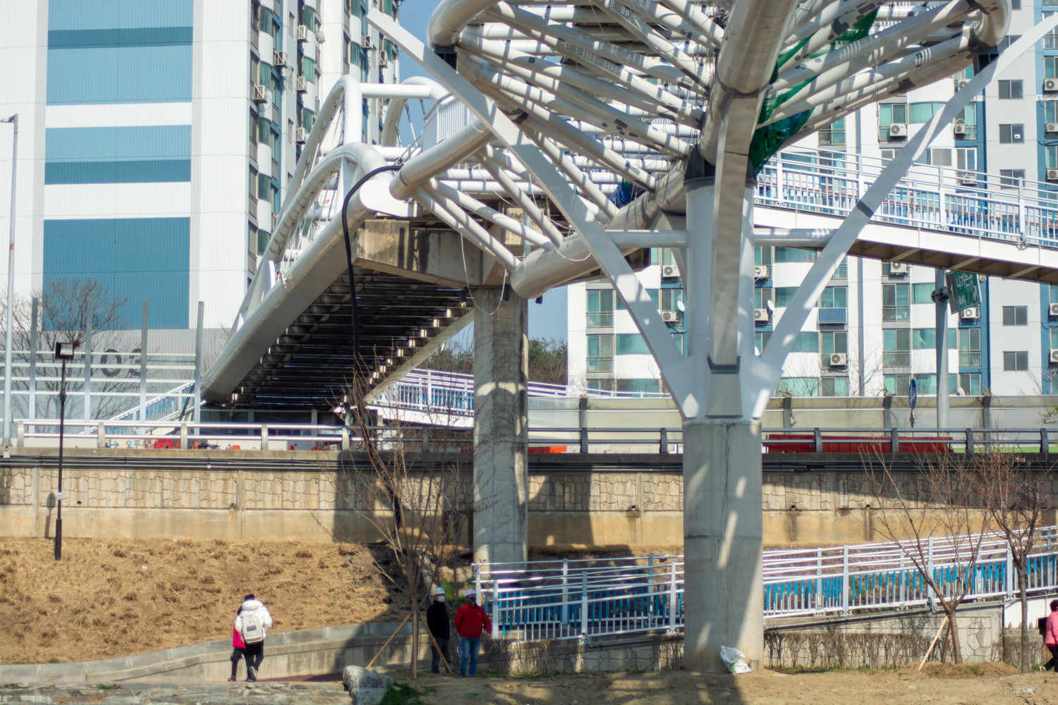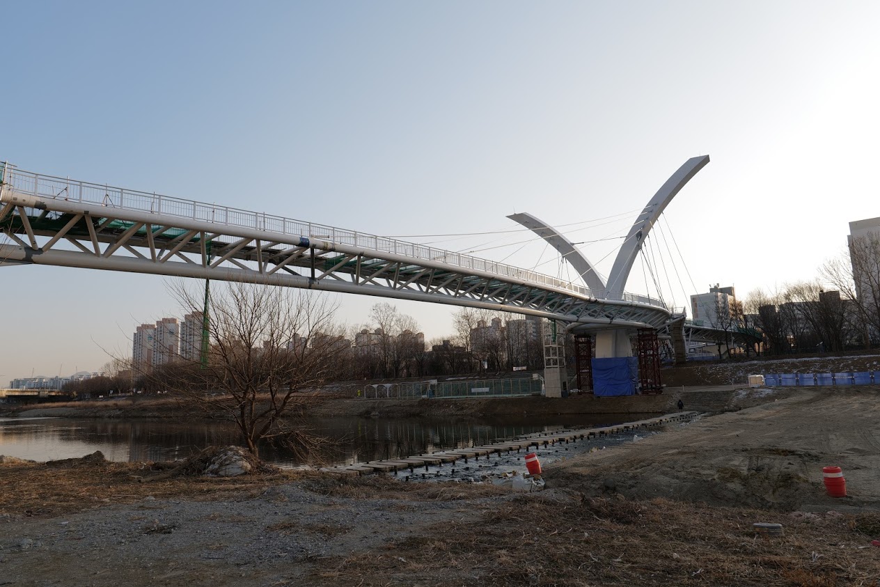 금천현대아파트에서 광명시 쪽 독산 1동까지 연결해주는 공중보행교입니다. 아직 이름도 안 정해진 이 다리는 안양천을 건너는 다리입니다.