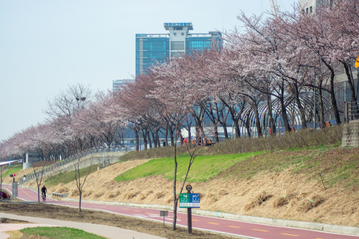 가산디지털단지 쪽 벚꽃길입니다. 이곳은 포장도로인데 최근에 황토색으로 포장을 했네요.