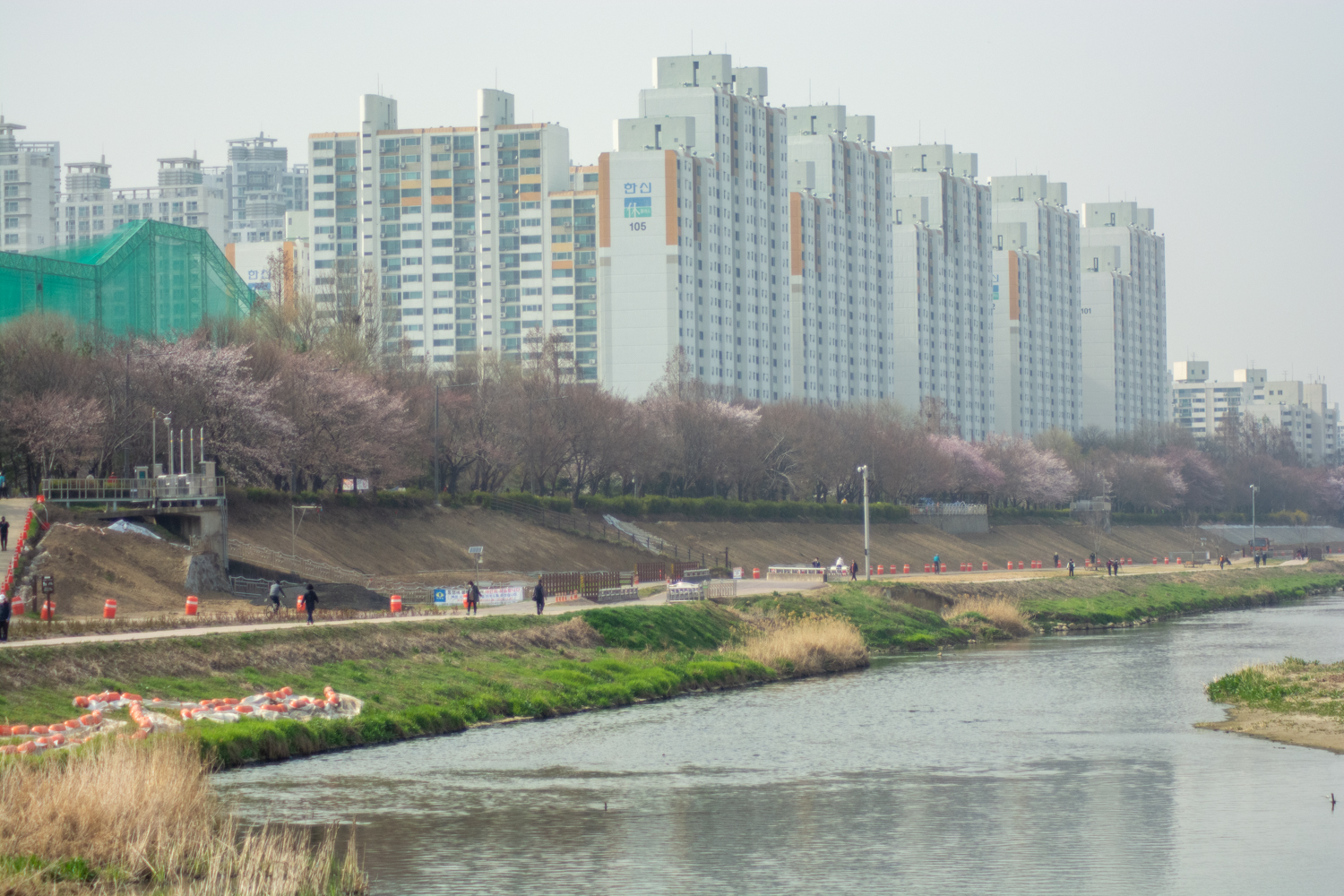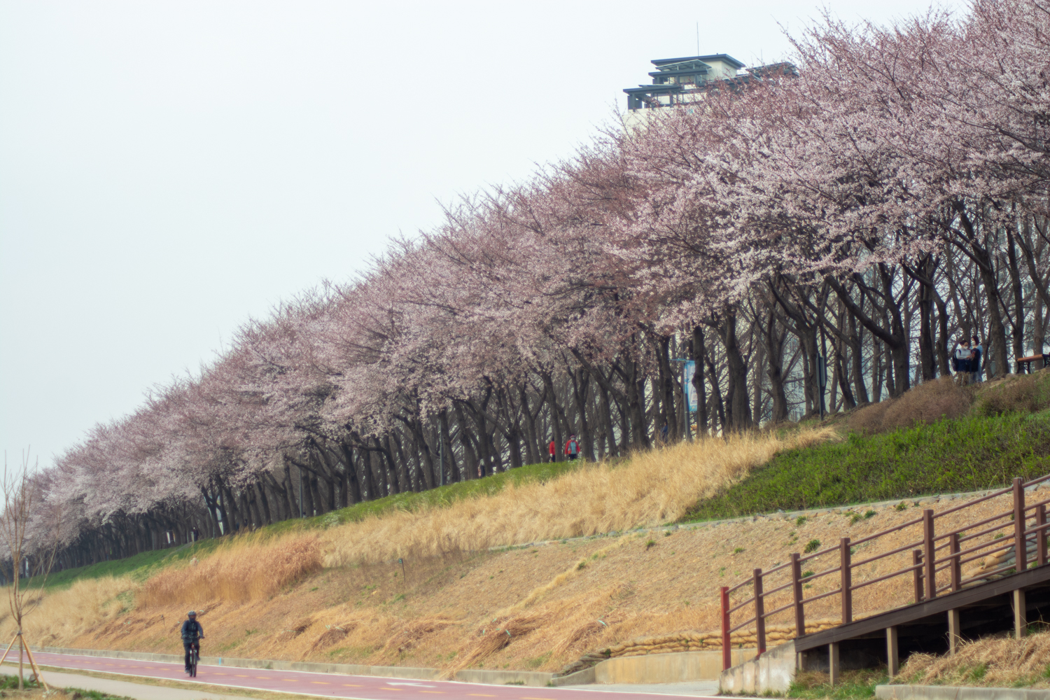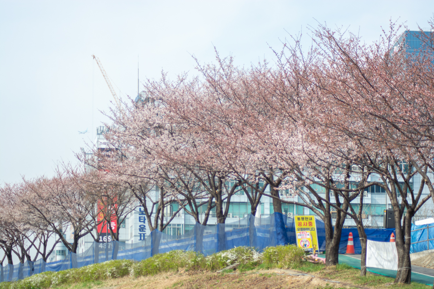 안양천은 독산역에서 내려서 5분만 걸으면 안양천 둔치가 나오는데 현재 서부간선도로 지하화 공사를 해서 벚나무를 많이 잘라 버리고 통제 구역이 꽤 있습니다. 그러나 광명시 쪽도 있고 조금만 걸으면 통제 구역이 끝나기에 벚꽃 구경하는 데는 지장 없습니다.