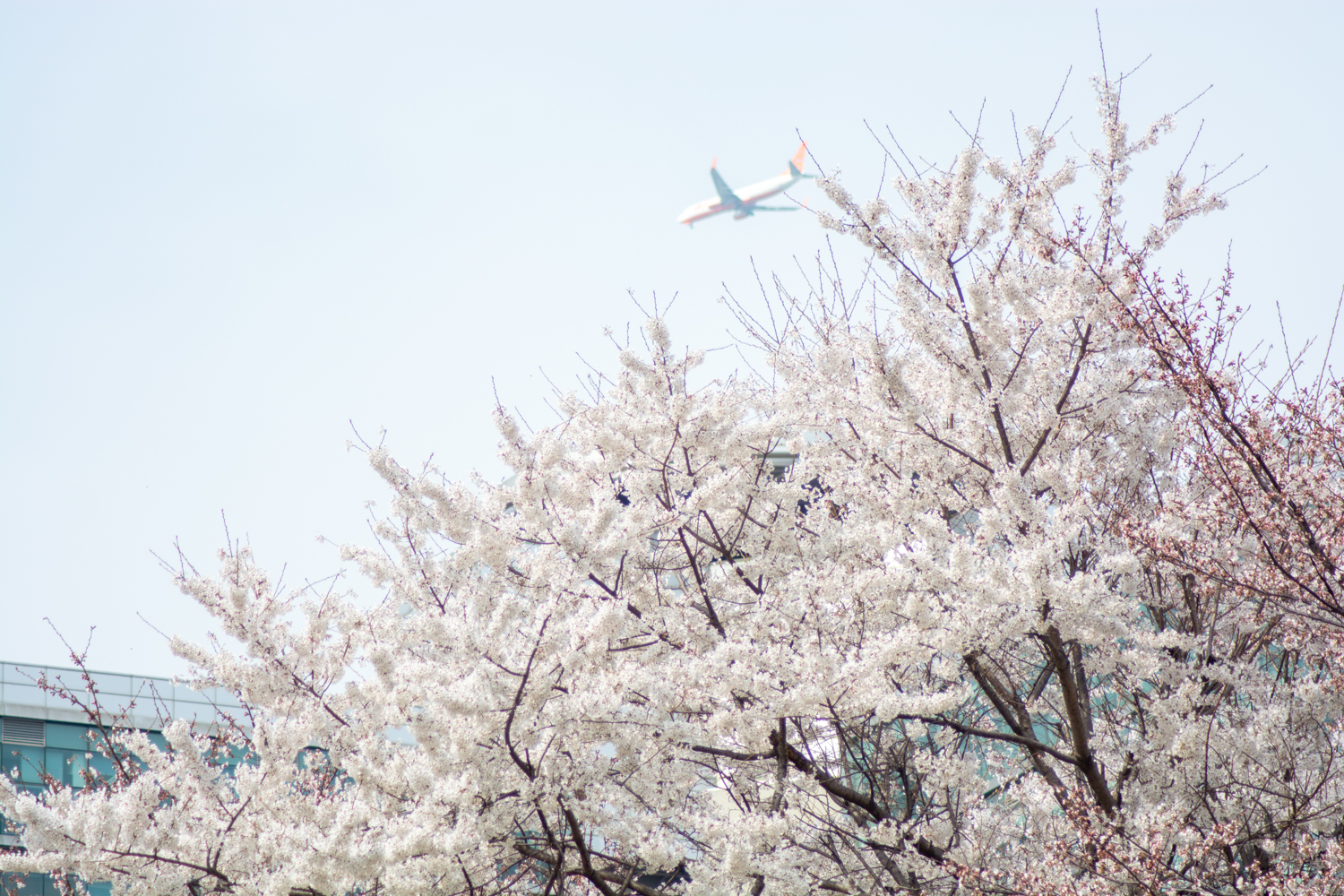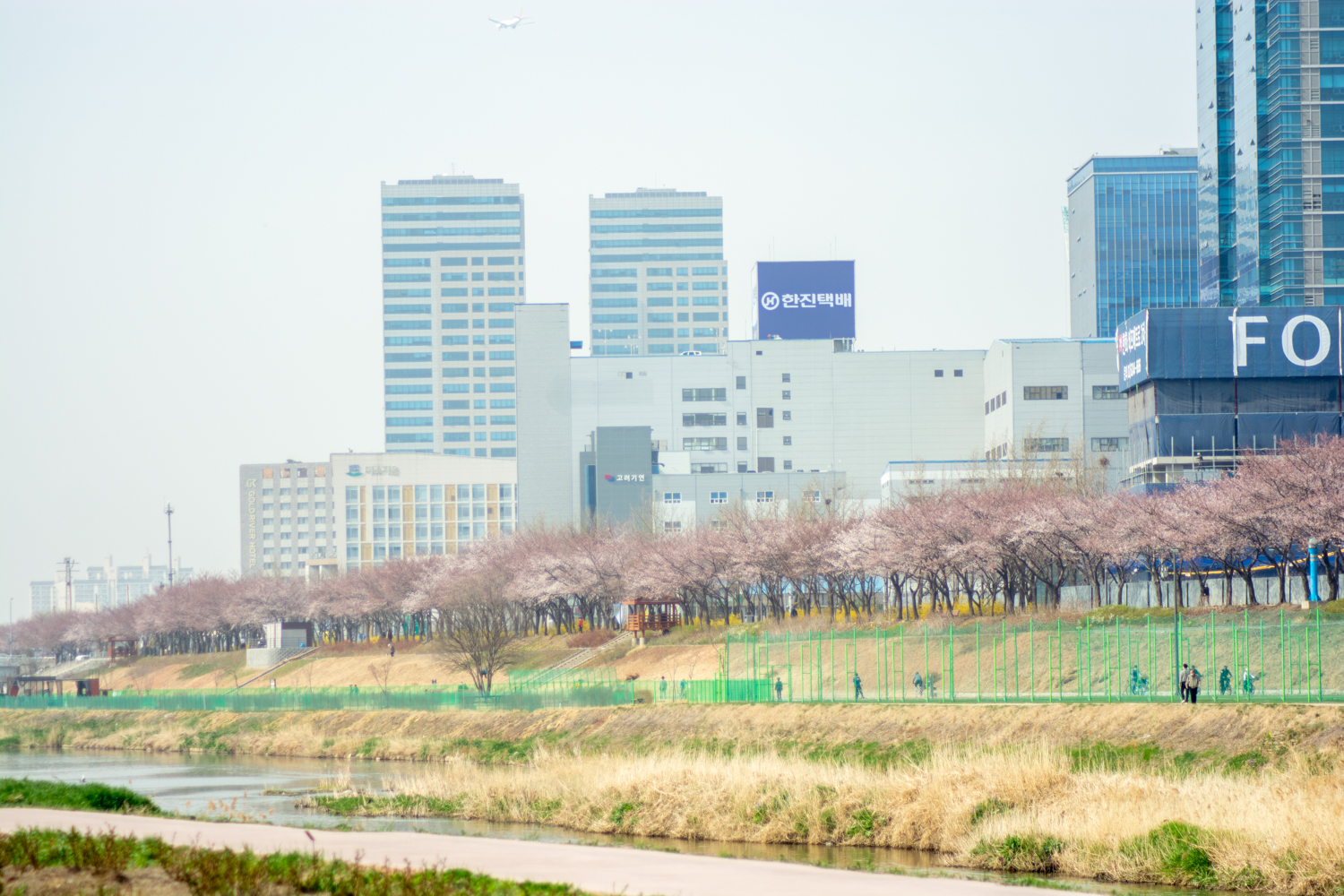 안양천의 벚꽃들이 만개한 벚나무도 꽤 많이 보이네요. 가산디지털단지 머리 위에는 하늘길이 있어서 김포공항으로 가는 비행기를 자주 많이 볼 수 있어요.