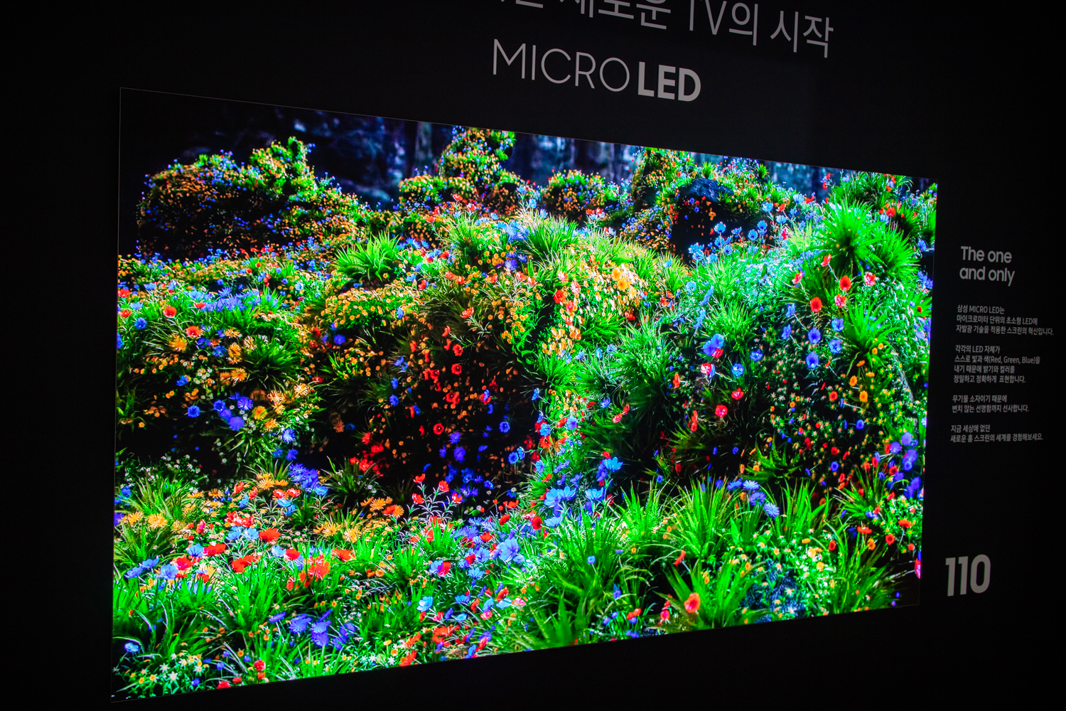 삼성전자 부스에서는 1억 6천만원 짜리 110인치 마이크로 LED TV가 선보였네요. 마이크로 LED TV는 아주 작은 LED를 서브픽셀로 활용한 TV입니다. 길거리에 수 많은 전광판들 가까이서 가면 큰 LED가 박혀 있는 걸 알 수 있죠. 대형 전광판에서는 큰 LED를 사용해도 멀리서 보기에 잘 모르죠. 그러나 집에서 사용하려면 LED가 작아야 합니다.