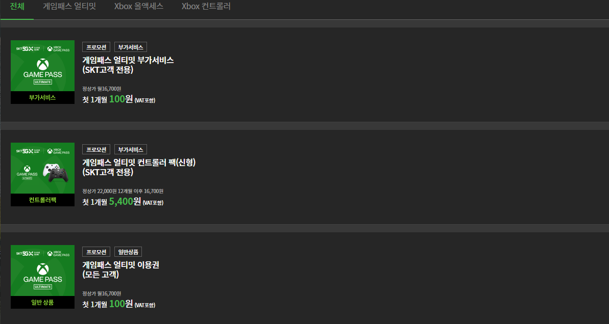 게임패스 얼티밋은 첫달은 100원이지만 다음달 부터는 16,700원으로 사용할 수 있습니다. 엑스박스 게임패스 얼티밋과 동일합니다. 엑스박스 무선 컨트롤러는 완납은 61,800원이고 월 5,832원 분납할 수 있습니다.