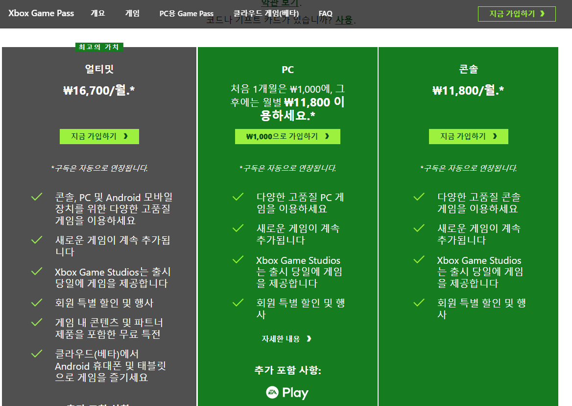별 차별성도 없는 게임 서비스죠. 다른 점은 오로지 모바일에서만 엑스박스 게임을 사용하고 싶은 분들을 위한 서비스입니다. 엑스박스 게임 컨트롤러를 완납하고 사도 되고 월정액으로 대여할 수도 있습니다.