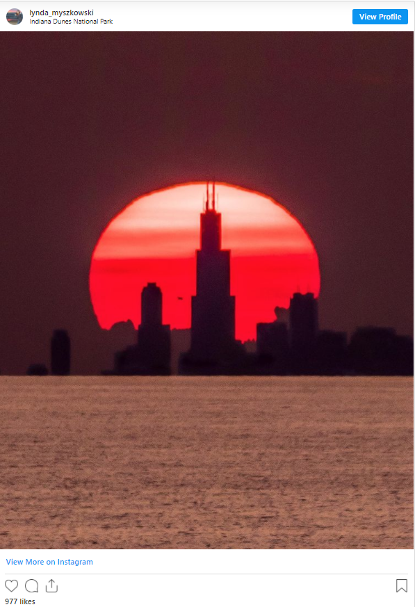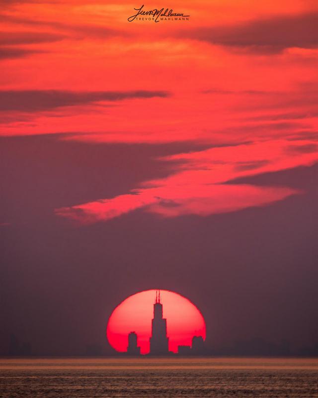 이 사진은 폰카로 찍은 사진은 아니고 거리가 엄청 먼 곳에서 사진작가 Lynda Myszkowski가 촬영한 사진입니다. 그런데 저 사진 속 빌딩이 어디서 많이 본 듯합니다. 네 맞아요. 바람의 도시인 시카고의 대표적인 빌딩이자 한 때 세계 최고 높이의 빌딩힌 '시어즈 타워'입니다. 시카고의 랜드마크 빌딩 뒤로 거대한 붉은 태양이 지고 있네요.