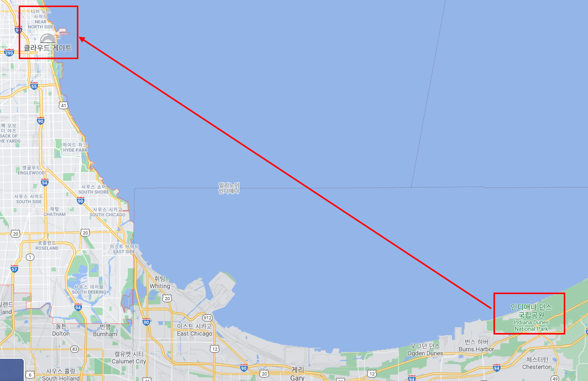 사진 속 바다 같은 곳은 바다는 아니고 미시간호입니다. 5 대호가 크다는 건 알았지만 엄청나게 크네요. 인디애나 듄스 국립공원 호숫가에서 반대편에 있는 시카고까지 거리는 80km입니다.